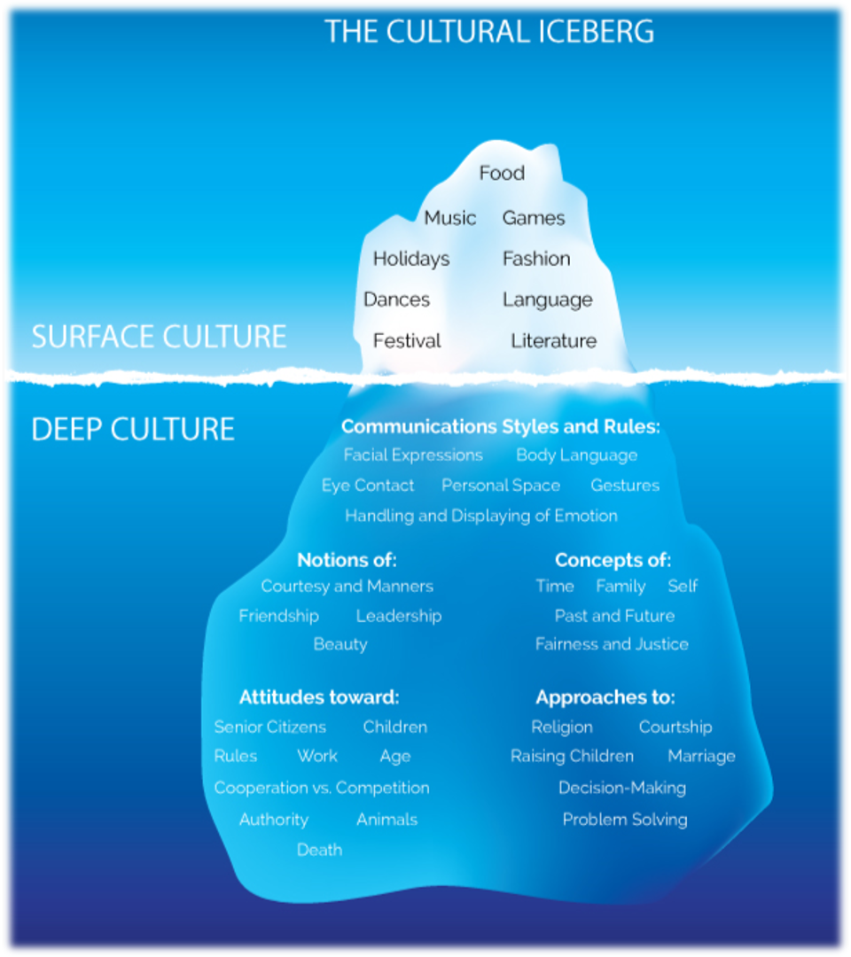 There are many different levels of culture, from family culture, to local culture, to national culture, organisational culture, and even to global regions such as “western culture”. What often comes to mind with regards to culture is that it is defined by what is obvious or seen. The Cultural Iceberg model below shows that this is only a fraction of what culture is. When thinking of another culture, we think of their festivals, traditional dress, languages, food, and games. However, under the surface there is a lot more detail to a culture that requires time, effort, and curiosity to explore.