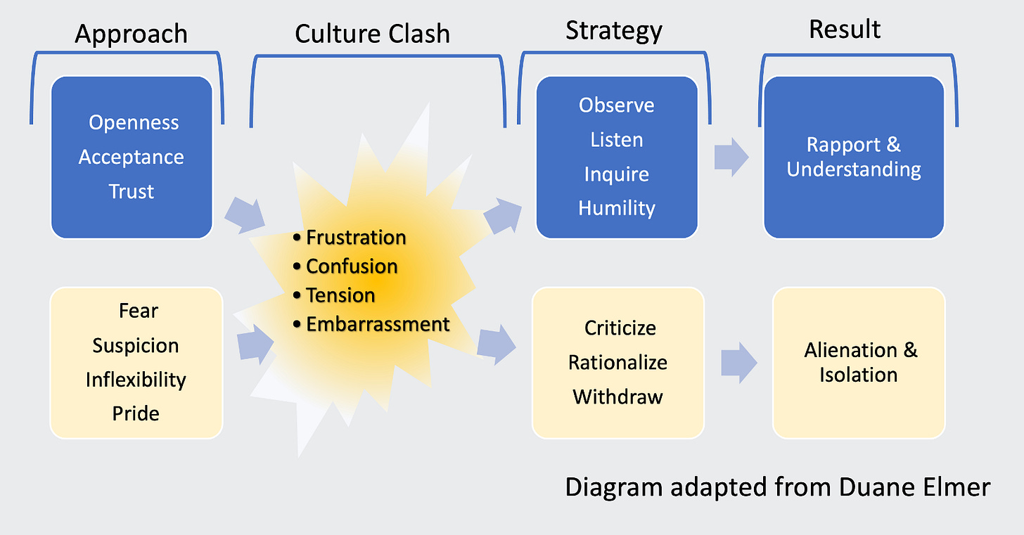 Duane Elmer3 offers the model above as a means of showing how a strategy of a humble attitude and an approach that seeks to learn from and accept difference, can lead to much healthier relational outcomes. Culture clash will happen, so reflecting on your response and approach to someone who has a different view of the world to you is a good starting point.