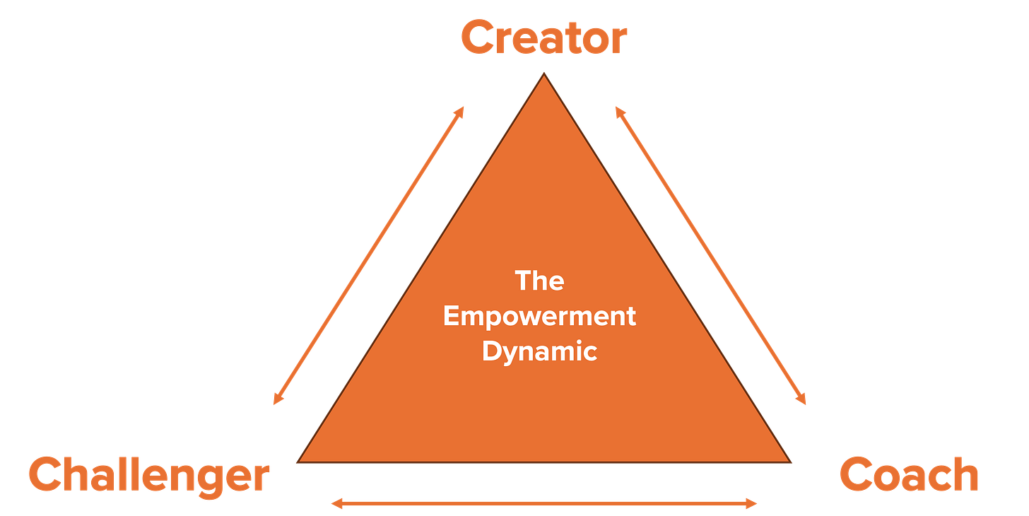 One response to the drama triangle is called “The Empowerment Dynamic” which was developed by David Emerald which quite literally flips the triangle.